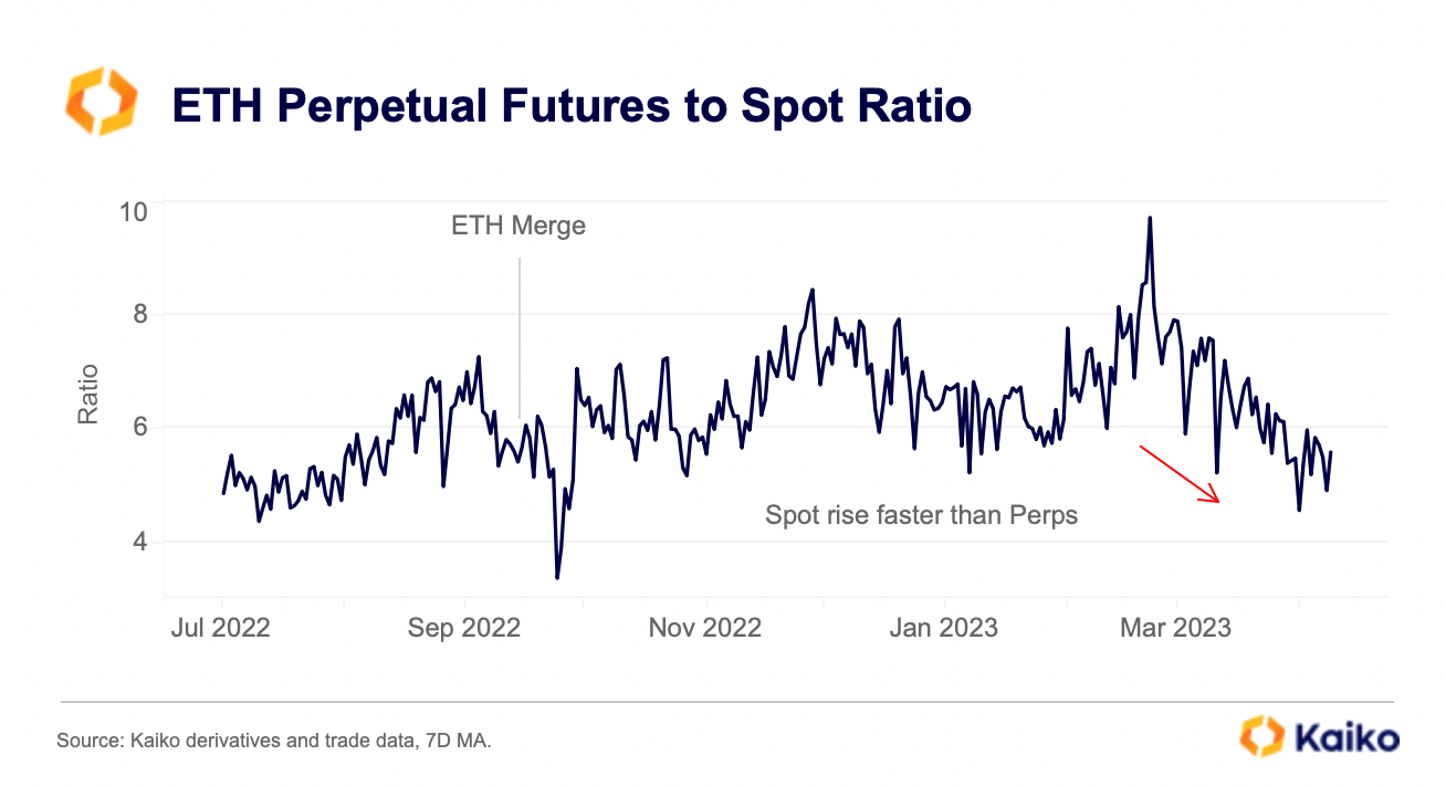 In a report published on Tuesday, Kaiko, a crypto data company, pointed out that ETH markets have been predominantly driven by spot trading in the last month. The perpetual futures-to-spot ratio reached its lowest level since the network's Merge in September. This is in stark contrast to the beginning of the year when the ratio had surged to almost double the pre-Merge levels.