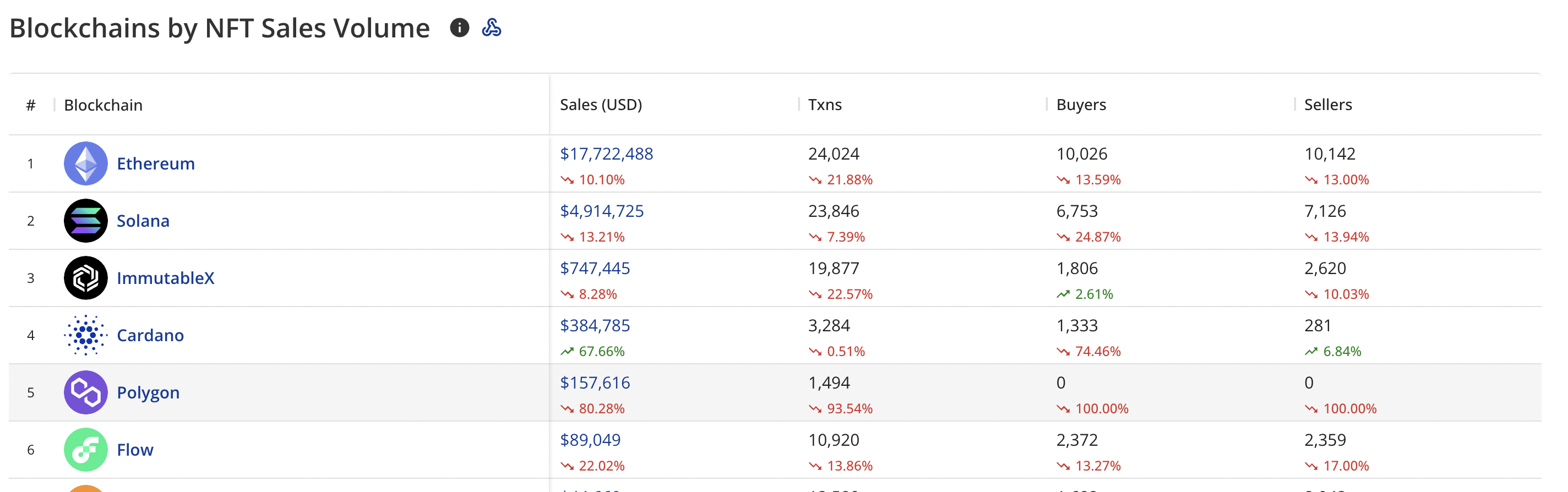 The expansion of NFT sales on alternative blockchains coincides with a recent decline in Ethereum NFT sales. According to Crypto Slam, Ethereum's sales volume has decreased by 12% in the past seven days, and there has also been a decrease in the number of unique buyers and sellers on the Ethereum platform.