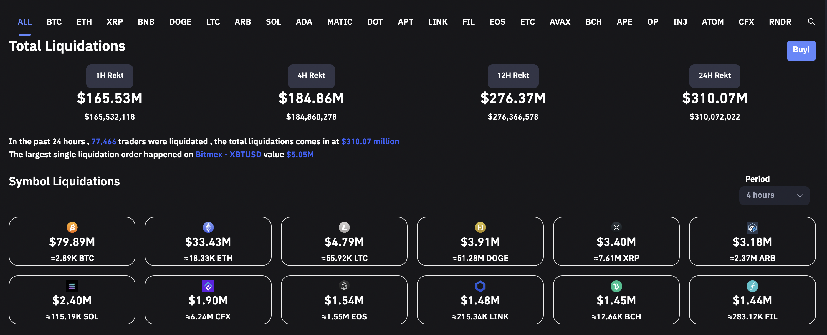 Coinglass data reveals that in the past 24 hours, traders were hit with losses totaling around $310 million from liquidations caused by the extreme swings in cryptocurrency prices, which resulted in the liquidation of both long and short positions.