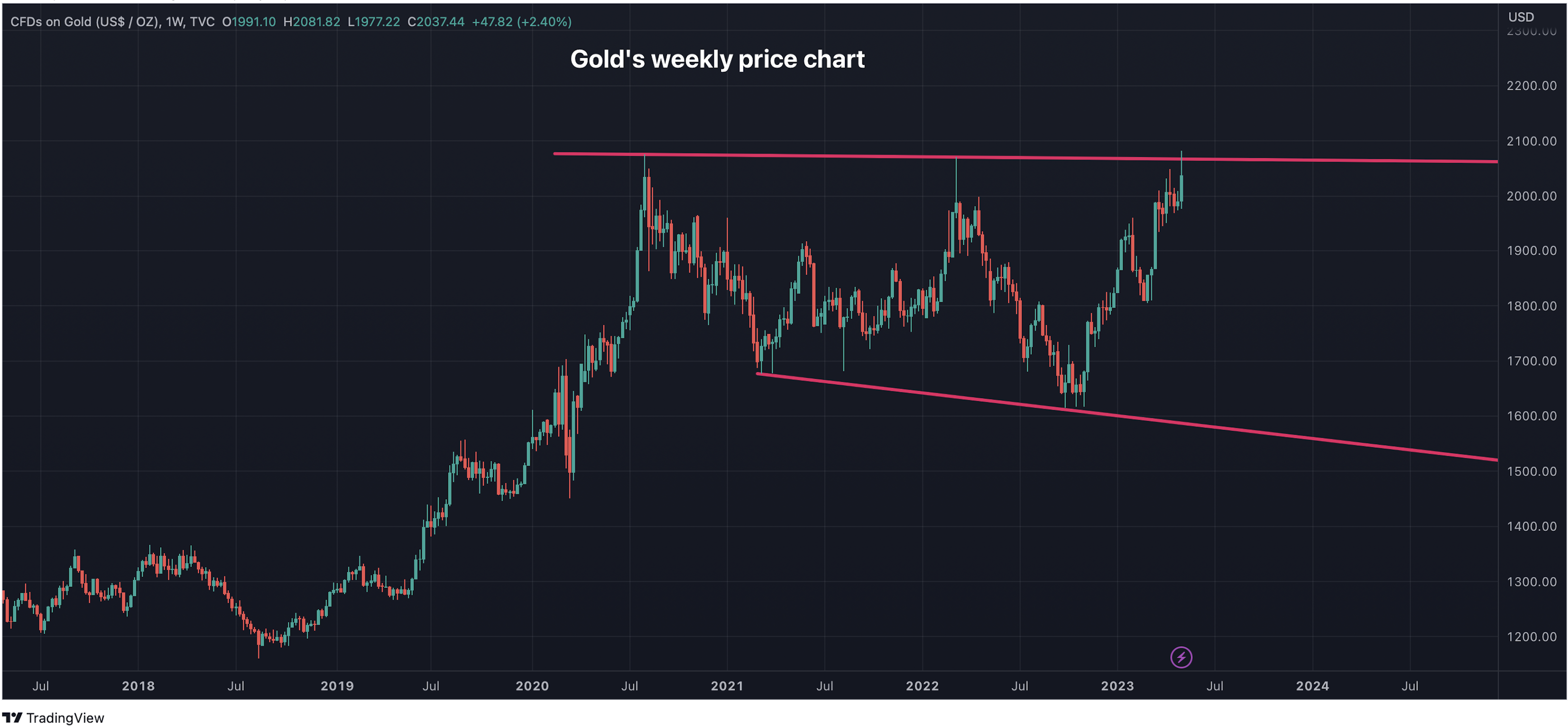 - The price of gold is poised to surpass its three-year trading range amidst a multitude of uncertainties, such as the U.S. debt ceiling dilemma, instability in the banking sector, and concerns of an impending recession.