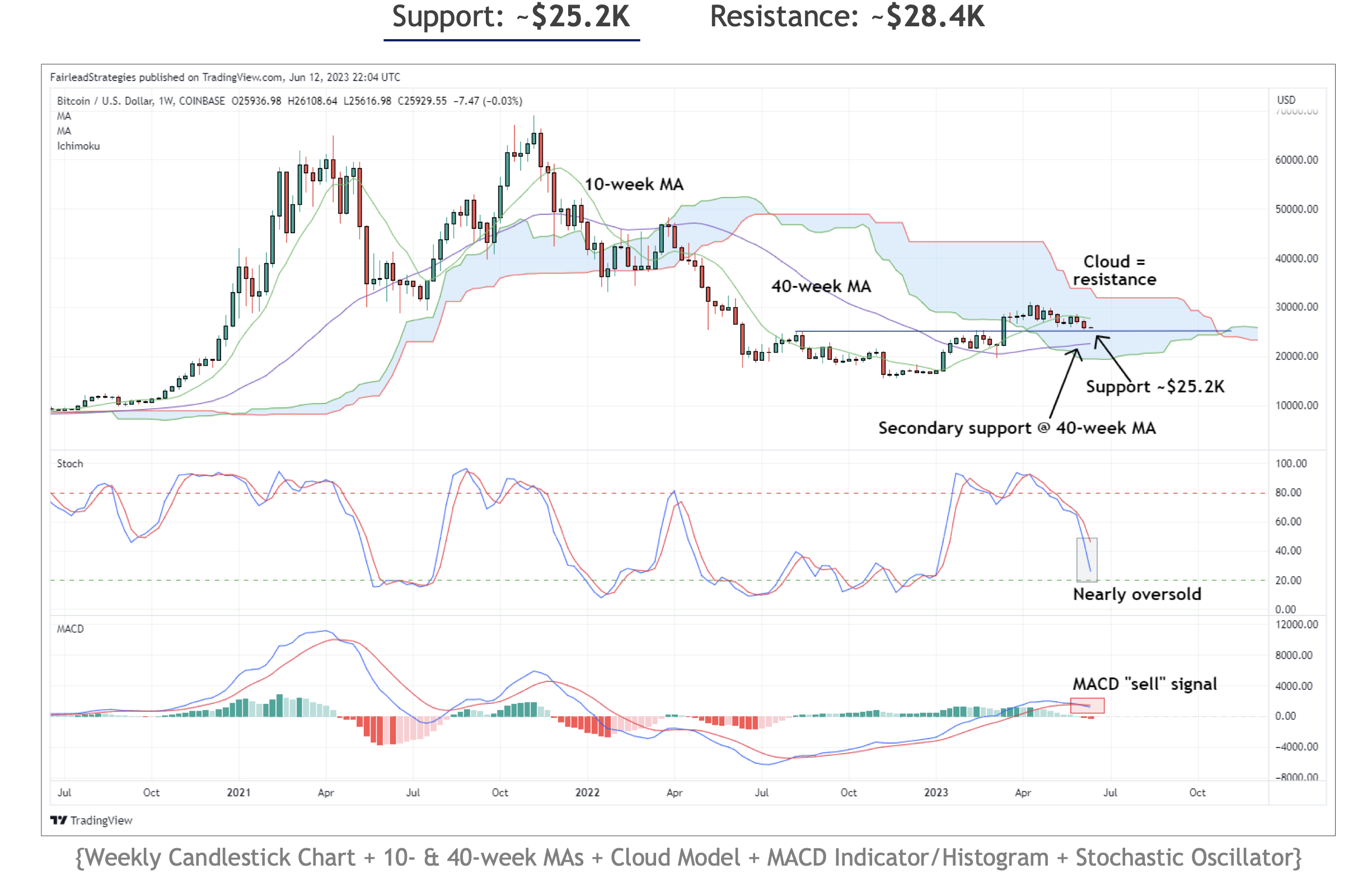 In the weekly chart, Bitcoin is demonstrating resilience at the $25,200 support level, as indicated by the horizontal line. The stochastic indicator is also indicating a potential oversold condition, with a reading just below 20.