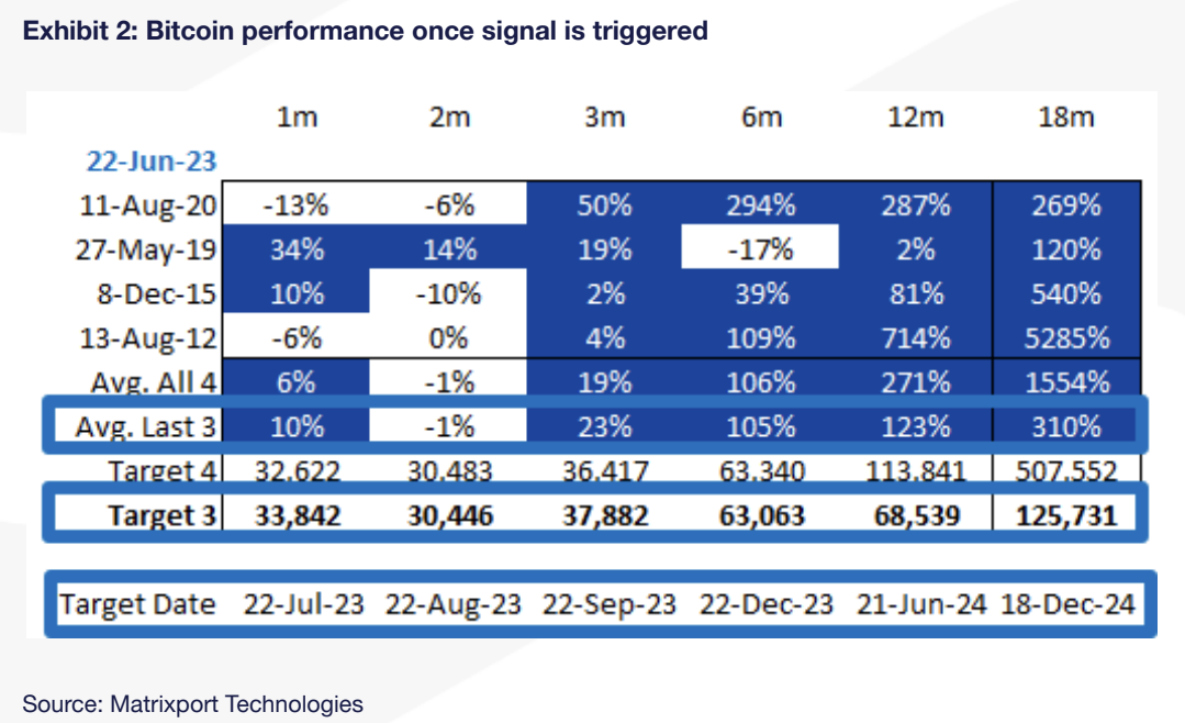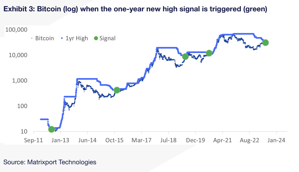 Bitcoin performance after previous "one-year high signal". (Matrixport)